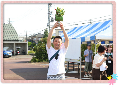 テントにはいろいろなゲームコーナーを用意しました。 こちらは野菜詰め放題ゲームの会場です。 制限時間内にビニール袋いっぱいに野菜を詰め込みます!! |
