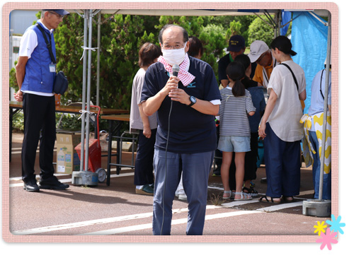 続いて、高志2丁目の自治会長さんのご挨拶。 天気にも恵まれて、大勢の方が参加してくださいました。 |