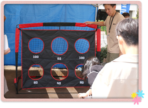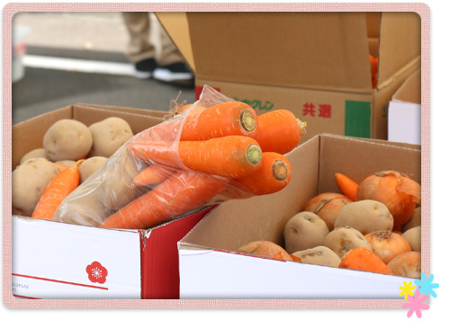 テントにはいろいろなゲームコーナーを用意しました。 こちらは野菜詰め放題ゲームの会場です。 制限時間内にビニール袋いっぱいに野菜を詰め込みます!! |